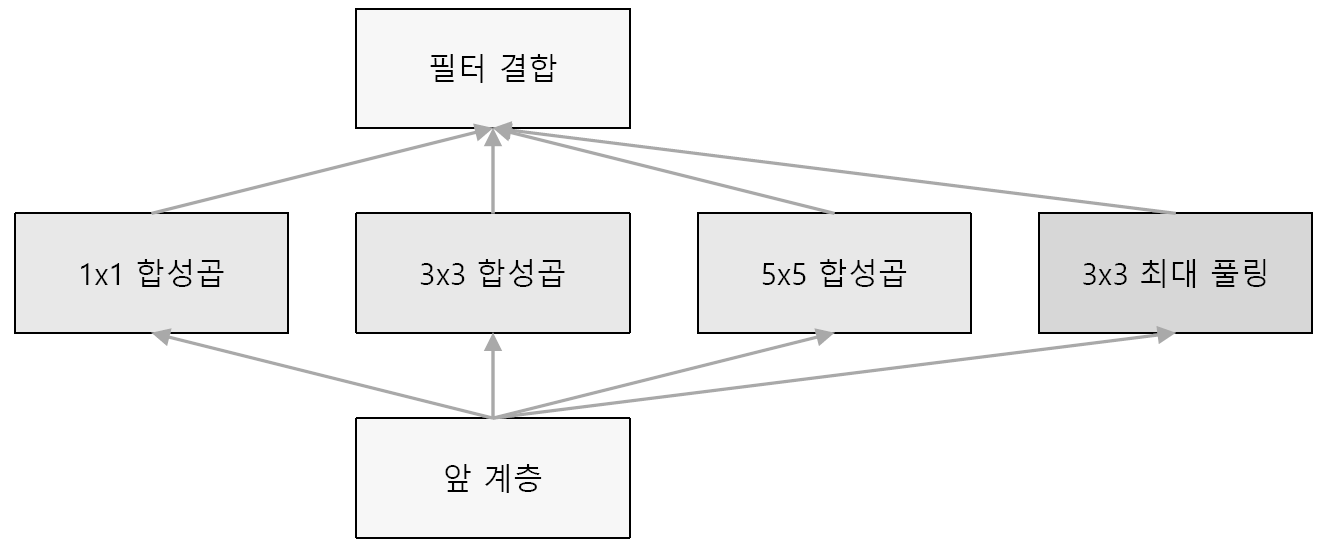 GoogLeNet은 세로 방향 깊이뿐 아니라 가로 방향도 깊다는 점이 특징이다. GoogLeNet에는 가로 방향에 ‘폭’이 있다. 이를 인셉션 구조라 하며, 그 기반 구조는 [그림 8-11]과 같다.