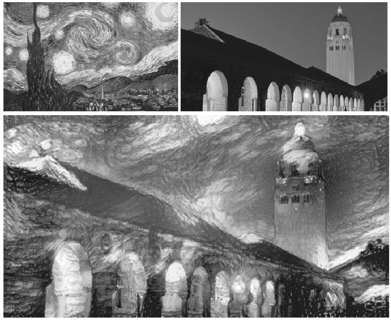 [그림 8-22]은 두 이미지를 입력해서 새로운 그림을 생성하는 연구이다. 하나는 ‘콘텐츠 이미지’, 다른 하나는 ‘스타일 이미지’라 부르는데, 이 둘을 조합해 새로운 그림을 그린 것이다. 이 기법을 담은 논문은 [A Neural Algorithm of Artistic Style]이다.
