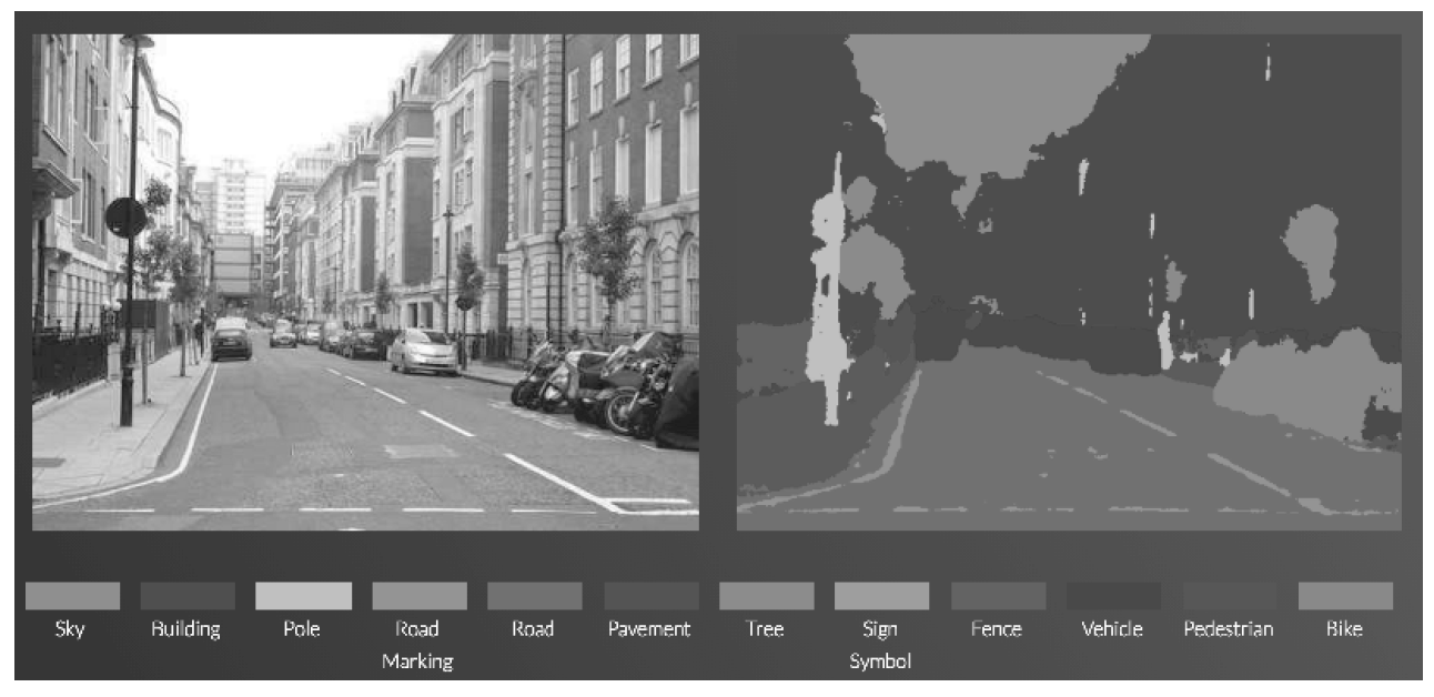 SegNet이라는 CNN 기반 신경망은 [그림 8-25]와 같이 주변 환경을 정확하게 인식해낸다. 입력 이미지를 분할(픽셀 수준에서 판정)하고 있다. 결과를 보면 도로와 건물, 보도와 나무, 차량과 오토바이 등을 어느 정도 정확히 판별하는 것을 볼 수 있다.