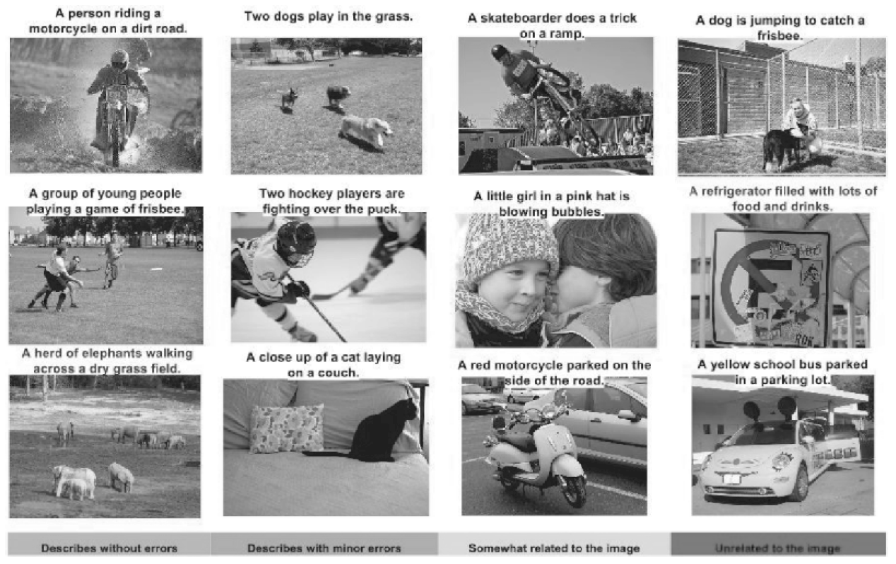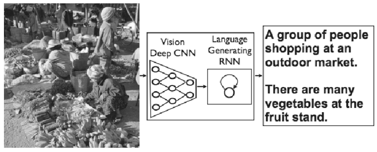 [그림 8-20]는 사진을 주면, 그 사진을 설명하는 글을 자동으로 생성하는 연구이다. 컴퓨터 비전과 자연어를 융합한 결과물이다.