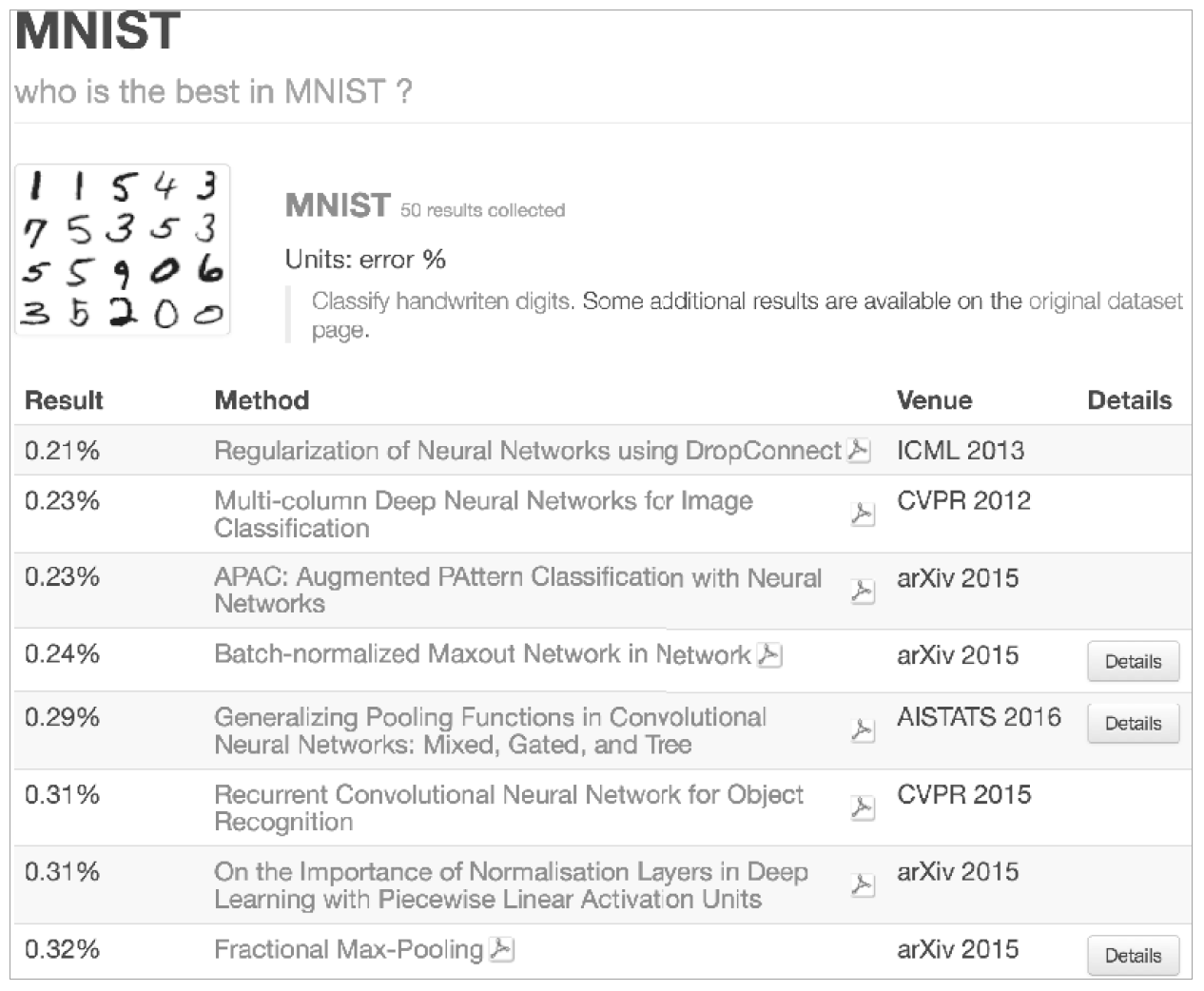 [그림 8-3]은 MNIST 데이터셋에 대한 각 기법들을 정확도를 기준으로 매긴 순위이다. 상위권은 대부분 CNN을 기초로 한 기법들이며, 앙상블 학습, 학습률 감소, 데이터 확장 등이 정확도를 향상시키고 있다.