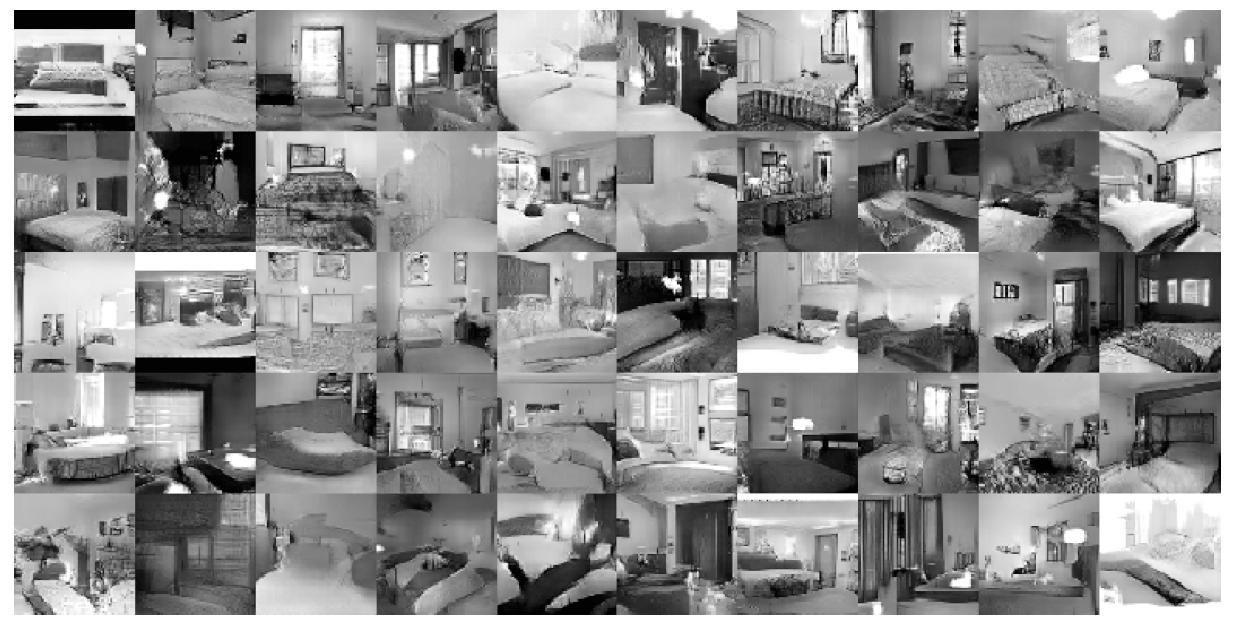 앞의 이미지 스타일 변환 예는 새로운 그림을 생성하려면 이미 두 장을 입력해야 했다. 이에 반해 아무런 입력 이미지 없이도 새로운 이미지를 그려내는 연구도 존재한다. [그림 8-24]의 이미지는 DCGAN(Deep Convolutional Generative Adversarial Network) 기법으로 생성한 침실 이미지들이다.