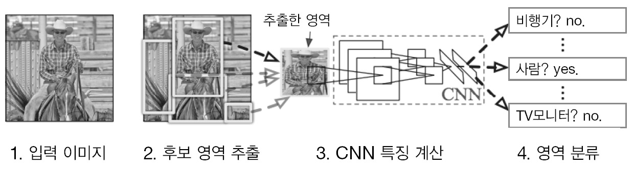 R-CNN 처리 흐름에서 주목할 곳은 ‘후보 영역 추출’과 ‘CNN 특징 계산’이다. 먼저 사물이 위치한 영역을 찾아내고, 추출한 각 영역에 CNN을 적용하여 클래스를 분류하는 것이다. 여기서 이미지를 사각형으로 변형하거나 분류할 때 서포트 벡터 머신(SVM)을 사용하는 등 실제 처리 흐름은 복잡하지만, 큰 틀에서는 이 두 가지 처리로 구성된다.