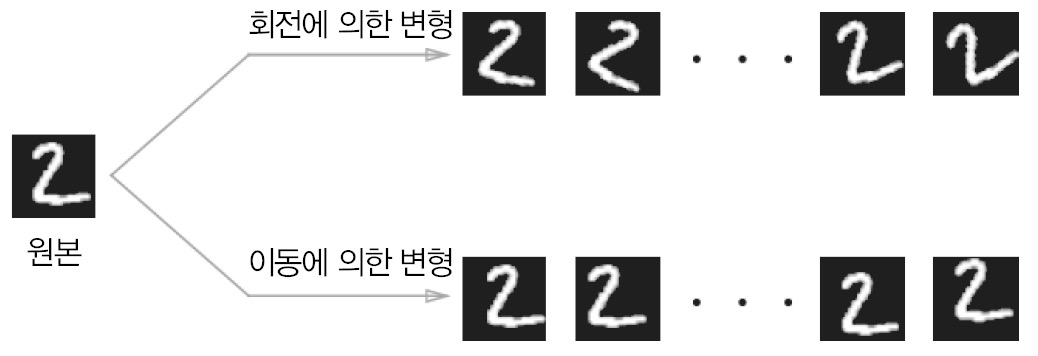 그중에서 데이터 확장(data augmentation)은 입력 이미지(훈련 이미지)를 ‘인위적’으로 확장하는 것이다. [그림 8-4]와 같이 입력 이미지를 회전하거나 세로로 이동하는 등 미세한 변화를 주어 이미지의 개수를 늘리는 것이다. 이는 데이터가 몇 개 없을 때 효과적인 수단이다. 이러한 변형 외에도 이미지 일부를 잘라내는 crop이나 좌우를 뒤집는 flip, 밝기 등의 외형 변화나 확대, 축소 등의 스케일 변화들이 있다. 이처럼 데이터 확장을 동원해 훈련 이미지의 개수를 늘리면 딥러닝의 인식 수준을 크게 개선할 수 있다.