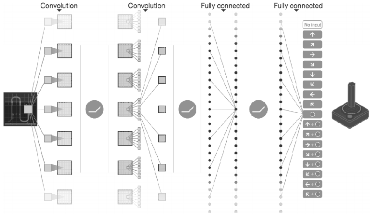 DQN 연구 중에는 비디오 게임을 자율 학습시켜 사람을 뛰어넘는 수준의 조작을 실현한 사례가 있다. [그림 8-26]과 같이 DQN에서 사용하는 CNN은 게임 영상 프레임(4개의 연속한 프레임)을 입력하여 최종적으로는 게임을 제어하는 움직임에 대하여 각 동작의 ‘가치’를 출력한다.