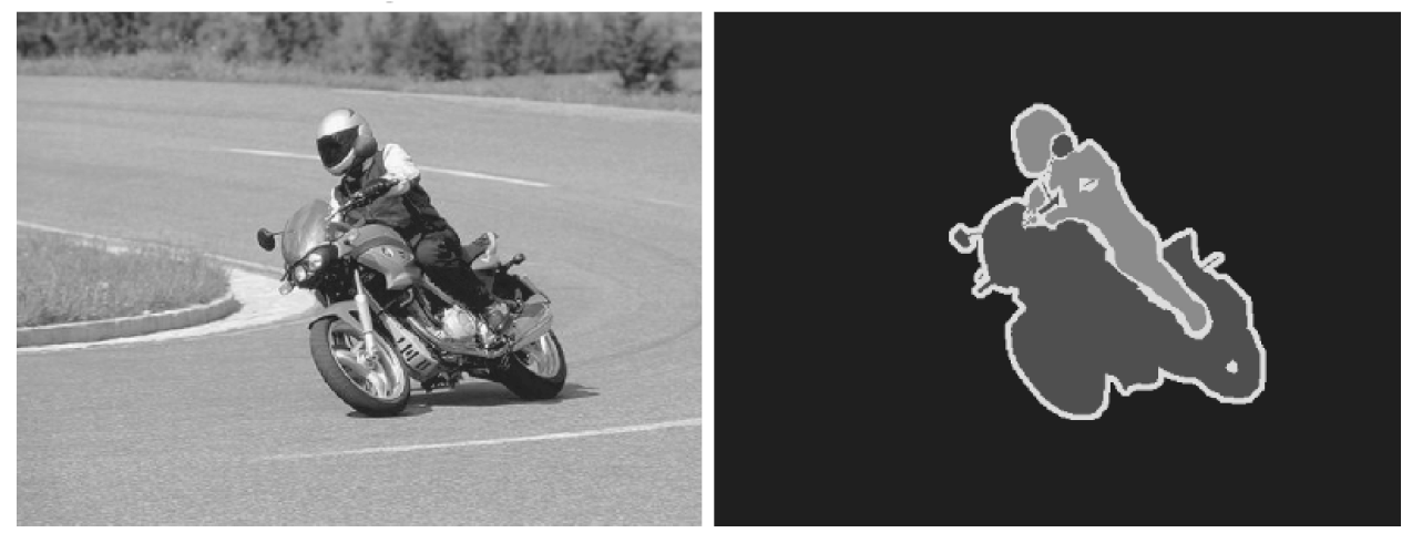 분할(segmentation)이란 이미지를 픽셀 수준에서 분류하는 문제이다. [그림 8-18]와 같이 픽셀 단위로 객체마다 채색된 지도(supervised) 데이터를 사용해 학습한다. 그리고 추론할 때 입력 이미지의 모든 픽셀을 분류한다.