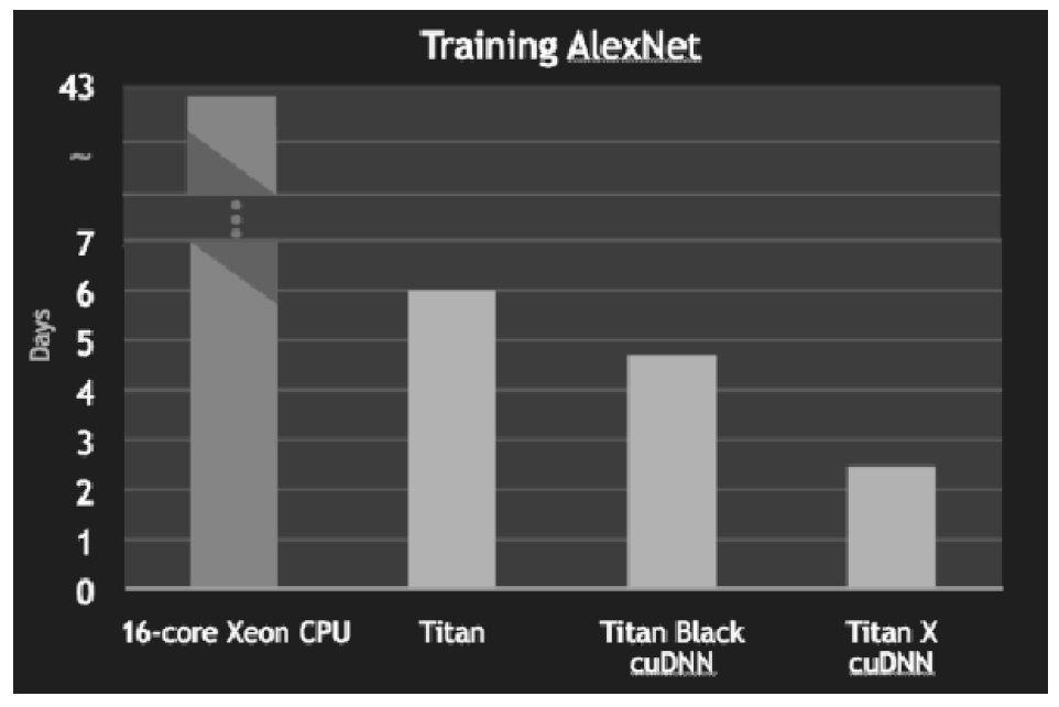 그림과 같이 CPU에서는 40여 일이나 걸리지만 GPU로는 6일까지 단축되었다. 또, cuDNN이라는 딥러닝에 최적화된 라이브러리를 이용하면 더욱 빨라진다.