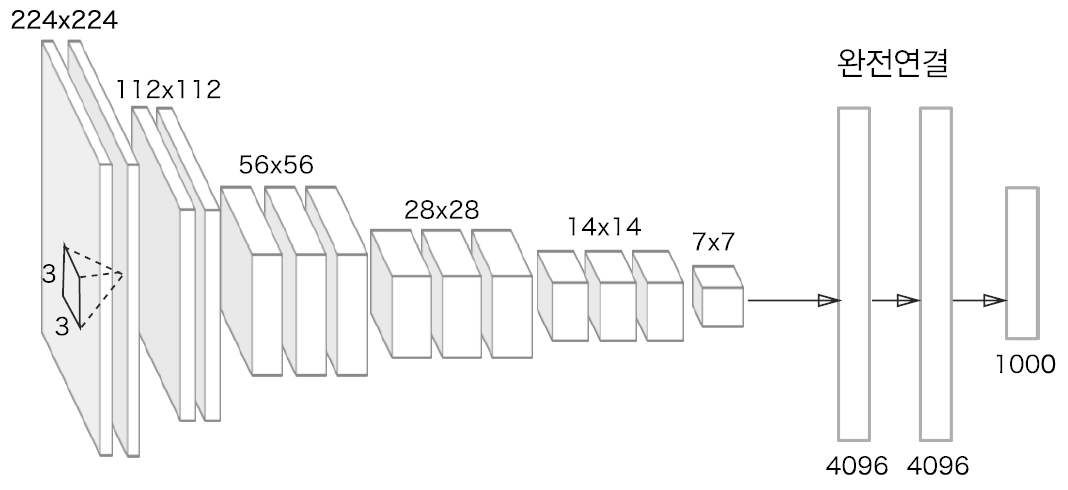 VGG에서 주목할 점은 3x3의 작은 필터를 사용한 합성곱 계층을 연속으로 거친다는 것이다. 그림에서 보듯 합성곱 계층을 2~4회 연속으로 풀링 계층을 두어 크기를 절반으로 줄이는 처리를 반복한다. 그리고 마지막에는 완전연결 계층을 통과시켜 결과를 출력한다.
