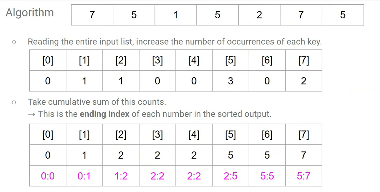 - 정렬할 배열 A[0..n-1] 의 값들이 0 ~ k 범위라고 하자.