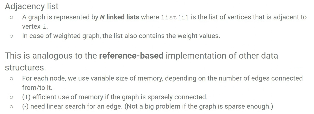 - 그래프가 희소 (sparse)한 경우에 효율적이므로 간선이 적은 큰 그래프에 대해 보통 연결 리스트를 적용한다.