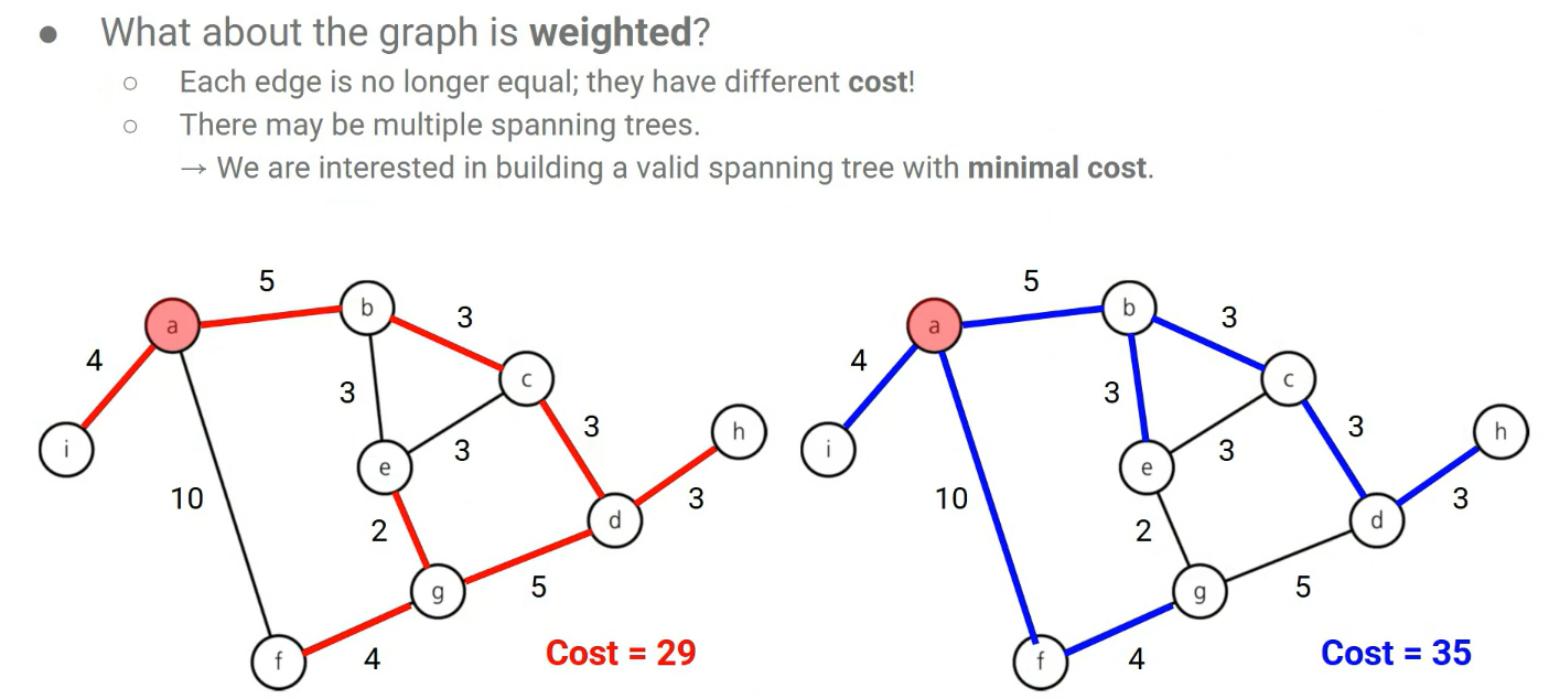 만약 weighted graph에서의 Spanning Tree를 만든다고 하면, 어떤 알고리즘을 사용하냐에 따라 간선 가중치의 합이 변화하게 된다. 이를 최소화 하는 것을 Minimum Spanning Tree (MST)라고 한다.