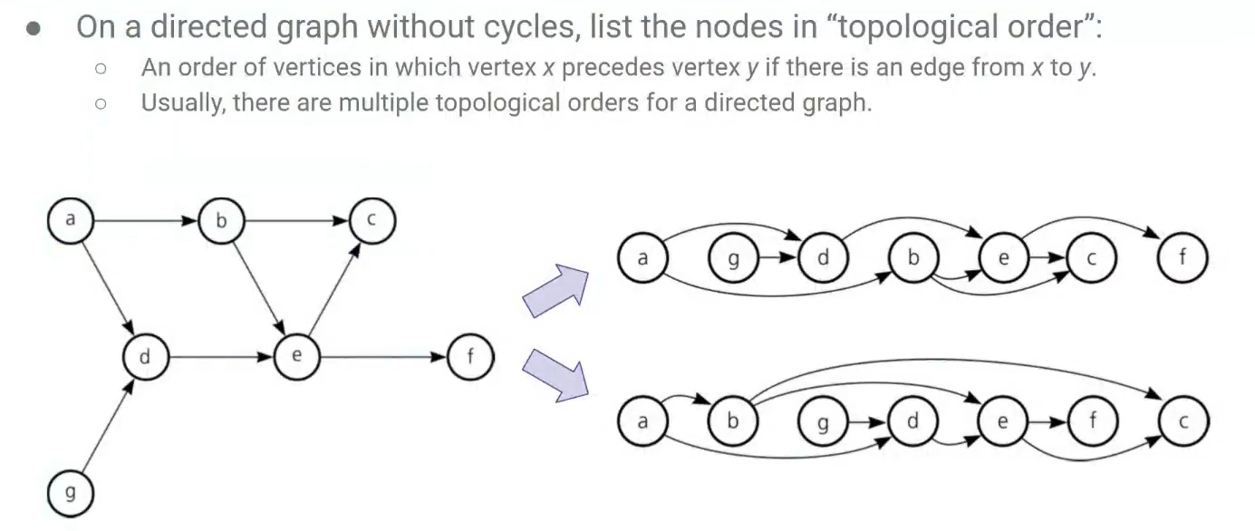 사이클이 없는 방향 그래프에서 모든 간선에 대해 간선 방향을 거슬러 올라가지 않도록 정점들을 나열하는 문제이다. 항상 여러 개의 답이 있을 수 있고, 그래프에 사이클이 하나라도 있으면 이런 순서를 만들 수 없으므로, 사이클이 존재하지 않는다고 가정한다.