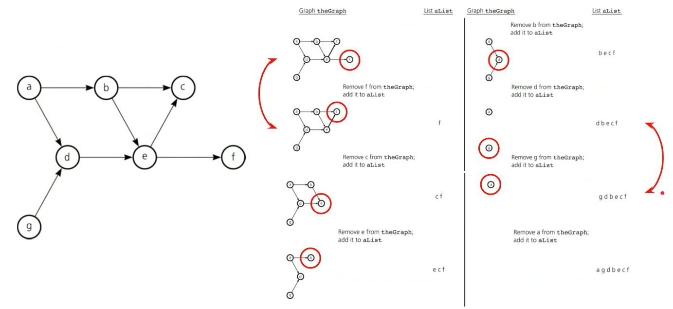 알고리즘의 핵심은 뒤에서부터 노드를 선택하는 것이다. 그리고 이미 리스트에 넣어버린 노드로 향하는 간선들은 더 이상 고려하지 않아도 되므로 삭제하는 것이다.