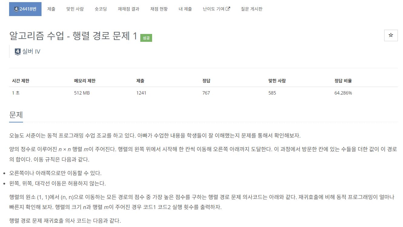 # Baekjoon 24418번: 알고리즘 수업 - 행렬 경로 문제 1