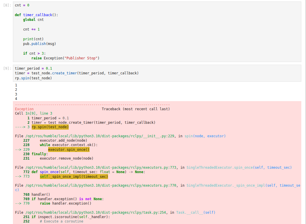 이제 작성한 timer_callback과 0.1로 지정한 timer_period를 가지고 test_node가 제공하는 create_timer를 만든다. 그러면 0.1초에 한 번씩 timer_callback 함수를 실행하게 되고, 작성한 대로 cmd_vel 토픽을 0.1초에 한 번씩 발행하게 된다. 그리고 타이머가 동작할 때까지 기다리도록 spin 명령어를 사용하였다.