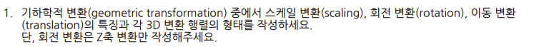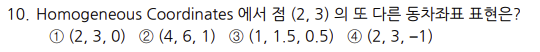 - 정답: 컴퓨터가 여러 변환을 효율적으로 처리하기 위해서 모든 연산을 행렬의 곱셈으로 통일 해야 한다. (Homogeneous coordinates)