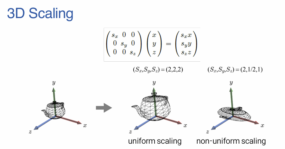 - 3차원 환경에서 크기 변환은 $x, y, z$ 축에 대한 크기 비율 $s_x, s_y, s_z$를 대각 원소로 가지는 3x3 행렬을 사용하여 정의한다.