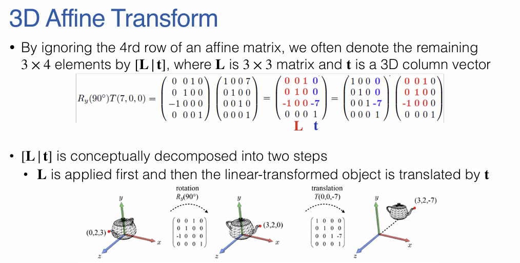 - 4번째 행을 제외한 3x4 크기의 부분 행렬을 $[L|t]$로 축약하여 표현할 수 있는데, 여기서 $L$은 3x3 크기의 선형 변환(Linear transform) 행렬을, $t$는 3D 이동 열 벡터를 의미한다.