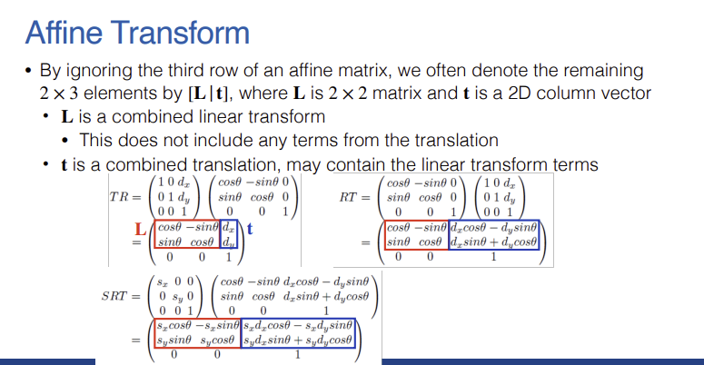 - 마지막 행이 항상 $(0, 0, 1)$이므로, 실제 연산에 영향을 주는 윗부분의 $2 \times 3$ 행렬만 따로 떼어내어 $[L|t]$ 형태로 간략히 표기할 수 있다.