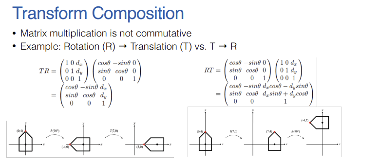 - 가장 중요한 점은, 동차좌표계를 사용해 모든 변환을 $3 \times 3$ 행렬로 규격화했기 때문에 점에 곱하기 전에 $T(7,0) \times R(90^\circ)$ 행렬끼리 먼저 곱하여 단일 변환 행렬을 만들 수 있다는 것이다. 연산 횟수를 줄여 그래픽 파이프라인의 속도를 크게 향상시키는 핵심 원리이다.