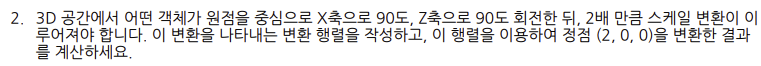 - 최종 변환 행렬 ($M$): $$M = \begin{pmatrix} 2 & 0 & 0 & 0 \\ 0 & 2 & 0 & 0 \\ 0 & 0 & 2 & 0 \\ 0 & 0 & 0 & 1 \end{pmatrix} \begin{pmatrix} 0 & -1 & 0 & 0 \\ 1 & 0 & 0 & 0 \\ 0 & 0 & 1 & 0 \\ 0 & 0 & 0 & 1 \end{pmatrix} \begin{pmatrix} 1 & 0 & 0 & 0 \\ 0 & 0 & -1 & 0 \\ 0 & 1 & 0 & 0 \\ 0 & 0 & 0 & 1 \end{pmatrix}$$