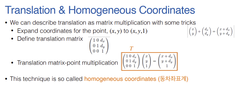 - 기존의 2D 좌표 $(x, y)$의 끝에 1을 추가하여 $(x, y, 1)$이라는 3차원 벡터로 확장한다.