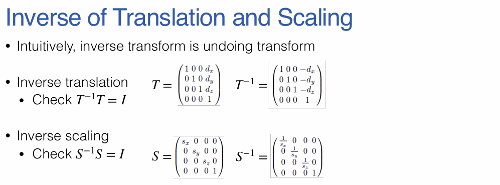 - 변환을 원래대로 되돌리는 역이동(Inverse translation)은 이동값의 부호를 반대로 변경($-d_x, -d_y, -d_z$)하여 계산한다.