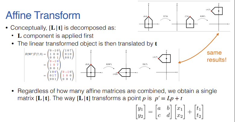 - 개념적으로 이 변환은 선형 변환 $L$이 먼저 적용된 후, 변환된 객체가 $t$만큼 이동하는 2단계 과정으로 분해하여 이해할 수 있다.