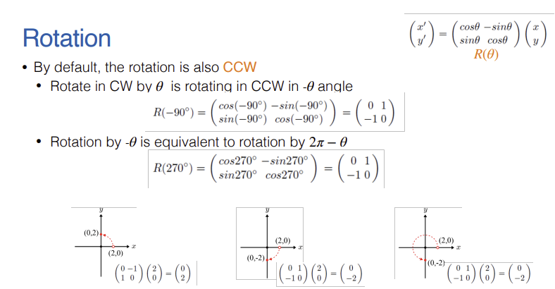 - $$\begin{pmatrix} x' \\ y' \\ 1 \end{pmatrix} = \begin{pmatrix} 0 & -1 & 4 \\ 1 & 0 & 5 \\ 0 & 0 & 1 \end{pmatrix} \begin{pmatrix} 2 \\ 3 \\ 1 \end{pmatrix}$$
