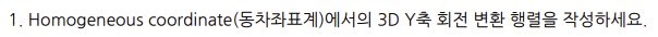 - 정답: $$R_y(\theta) = \begin{pmatrix} \cos\theta & 0 & \sin\theta & 0 \\ 0 & 1 & 0 & 0 \\ -\sin\theta & 0 & \cos\theta & 0 \\ 0 & 0 & 0 & 1 \end{pmatrix}$$