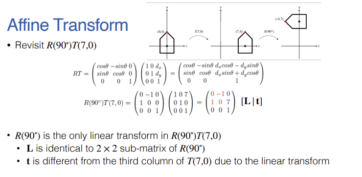 - 예시 분석: $x$축으로 $7$만큼 이동한 뒤 $90^\circ$ 회전하는 연산인 $R(90^\circ)T(7,0)$을 계산해 본다. 계산 결과 도출된 $[L|t]$ 행렬을 보면, $L$은 $R(90^\circ)$와 같지만, $t$는 $(7, 0)$이 아니라 $(0, 7)$이 되어 있다. 이는 먼저 수행된 이동 벡터 $(7, 0)$이 나중에 적용된 $90^\circ$ 회전의 영향을 받았기 때문이다.