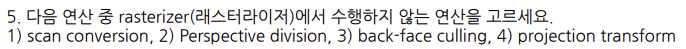 - 정답: 불투명도가 1.0 미만인 두 개의 반투명한 폴리곤이 겹칠 때 발생하는 렌더링 파이프라인의 연산 과정을 묻고 있다.