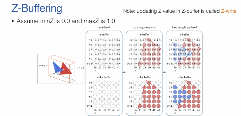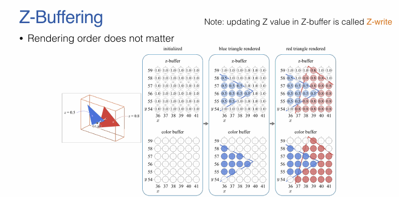 - 반대로 Z값이 더 작다면 color buffer를 갱신하고, Z-Buffer의 기록 또한 새로운 Z값으로 업데이트한다. 이러한 과정을 Z-Buffering이라 명명한다.