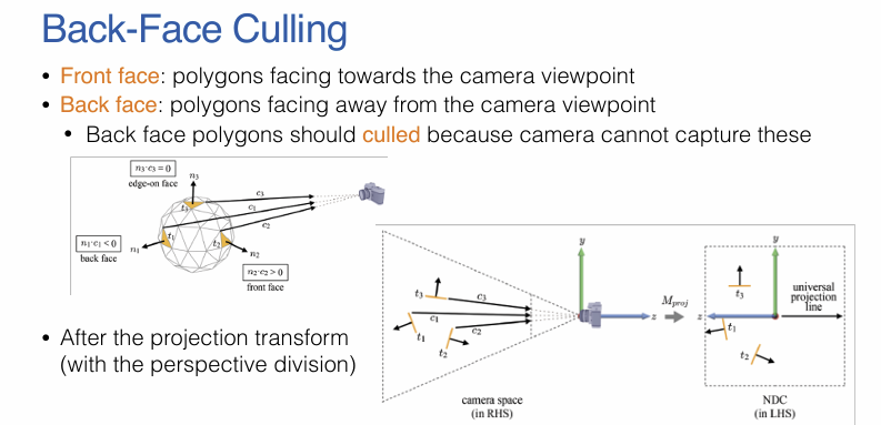 - 카메라는 물체의 뒷면을 포착할 수 없으므로 렌더링 파이프라인 과정에서 후면 polygon을 사전에 제거(Cull)하여 렌더링 연산량을 줄이게 된다.