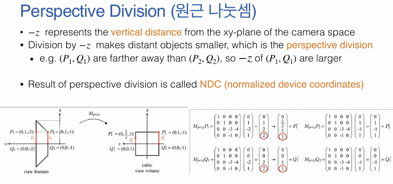 - 동차 공간(Clip space)에서 일반적인 3차원 데카르트 공간으로 변환하기 위해서는 행렬 연산 결과를 자신의 $w$ 좌표, 즉 $-z$로 나누어야 한다.