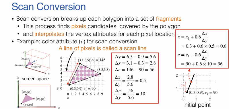 - 색상 보간은 이해를 돕기 위한 예시일 뿐이며, 실제 컴퓨터 그래픽스 Rendering pipeline의 Scan Conversion 단계에서는 주로 법선 벡터(Normal vectors, $n_x, n_y, n_z$)와 텍스처 좌표(Texture coordinates, 2D)가 독립적으로 보간된다.