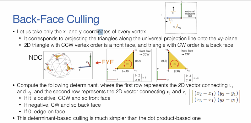 $$\begin{vmatrix} (x_2-x_1) & (y_2-y_1) \\ (x_3-x_1) & (y_3-y_1) \end{vmatrix}$$ - 해당 행렬식의 계산 결과가 양수이면 CCW(전면), 음수이면 CW(후면), 0이면 측면(Edge-on face)으로 간주된다.