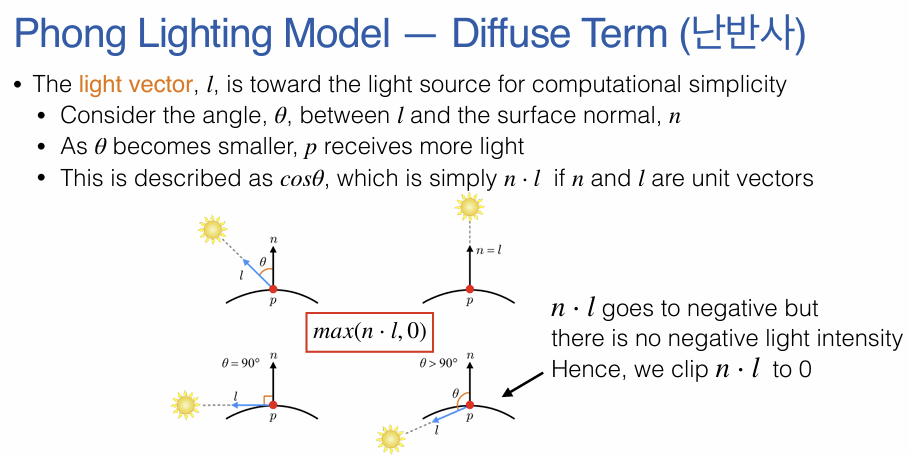 - 난반사 (Diffuse Term): 빛이 이상적인 표면에서 모든 방향으로 동일한 각도로 산란되는 성분이다. 표면의 법선 벡터($n$)와 빛의 방향 벡터($l$)가 이루는 각도에 비례하여 밝기가 결정된다.