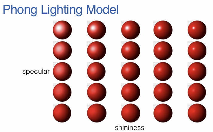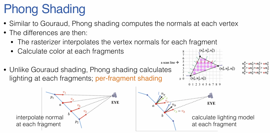 - 작동 원리: Rasterizer는 Polygon 내부의 각 fragment마다 고유한 법선 벡터를 도출한다. Phong shading은 이렇게 fragment마다 정교하게 보간된 법선 벡터를 바탕으로, fragment마다 조명 모델 수식을 개별적으로 계산한다.