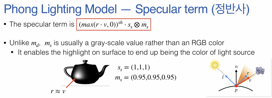 정반사 항(Specular Term)은 표면에 맺히는 하이라이트(highlight)를 통해 물체가 반짝이거나 매끄럽게 보이도록 만드는 역할을 한다.