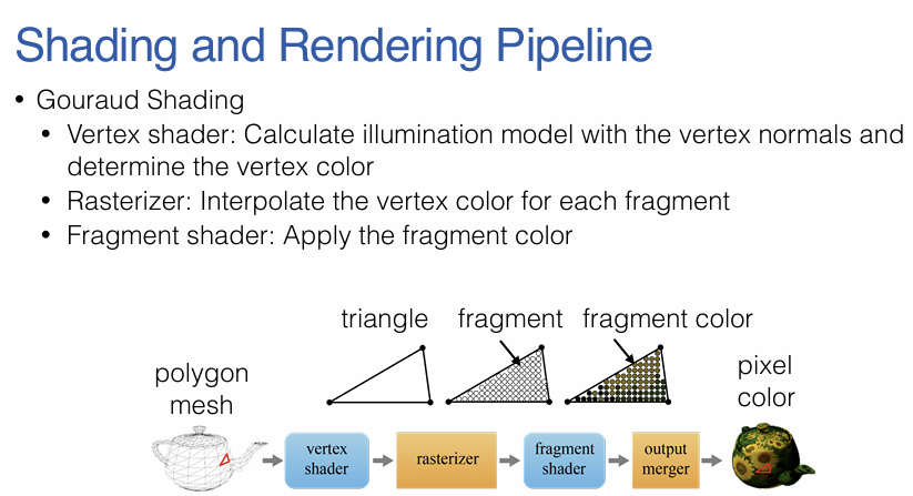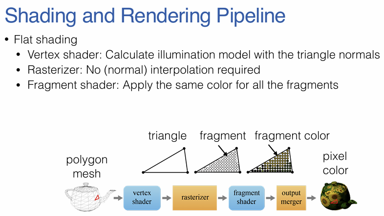 - Fragment Shader는 픽셀마다 보간된 법선 벡터를 이용해 조명 모델(Illumination model)을 개별적으로 계산하고 최종 색상을 결정한다.