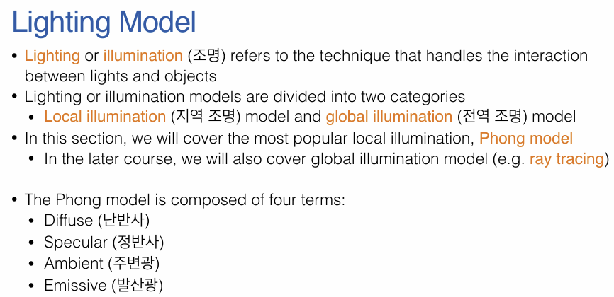 조명(Lighting/Illumination)은 빛과 물체 사이의 상호작용을 다루는 기법이며, Phong Lighting model은 대표적인 지역 조명(Local illumination) 모델이다.