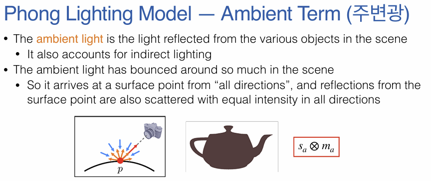 - 주변광 (Ambient Term): 씬(Scene) 내의 여러 물체에 반사되어 간접적으로 도달하는 조명 성분이다. 모든 방향에서 도달하여 모든 방향으로 산란되므로 물체의 기본 밝기를 보장하는 역할을 한다.