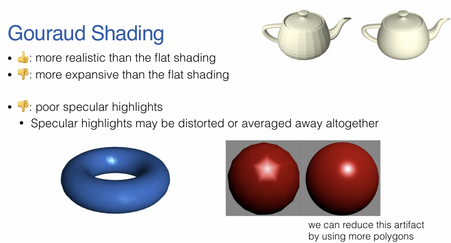 - 단점: Flat Shading에 비해 모든 정점마다 연산을 수행하고 내부를 보간해야 하므로 계산 비용이 증가한다. 또한 정반사 하이라이트가 심하게 왜곡되거나 평균화되어 사라져 버리는 현상이 발생한다.
