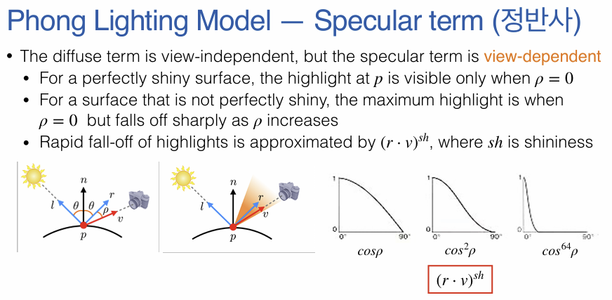 $$(r \cdot v)^{sh}$$ - 슬라이드 우측의 그래프를 보면 $sh$ 값이 1, 2, 64로 커질수록 그래프가 0으로 더 급격하게 떨어지는 것을 알 수 있다. 즉, $sh$ 값이 클수록 하이라이트가 좁고 선명하게 맺히며 더 매끄러운 재질을 표현하게 된다.
